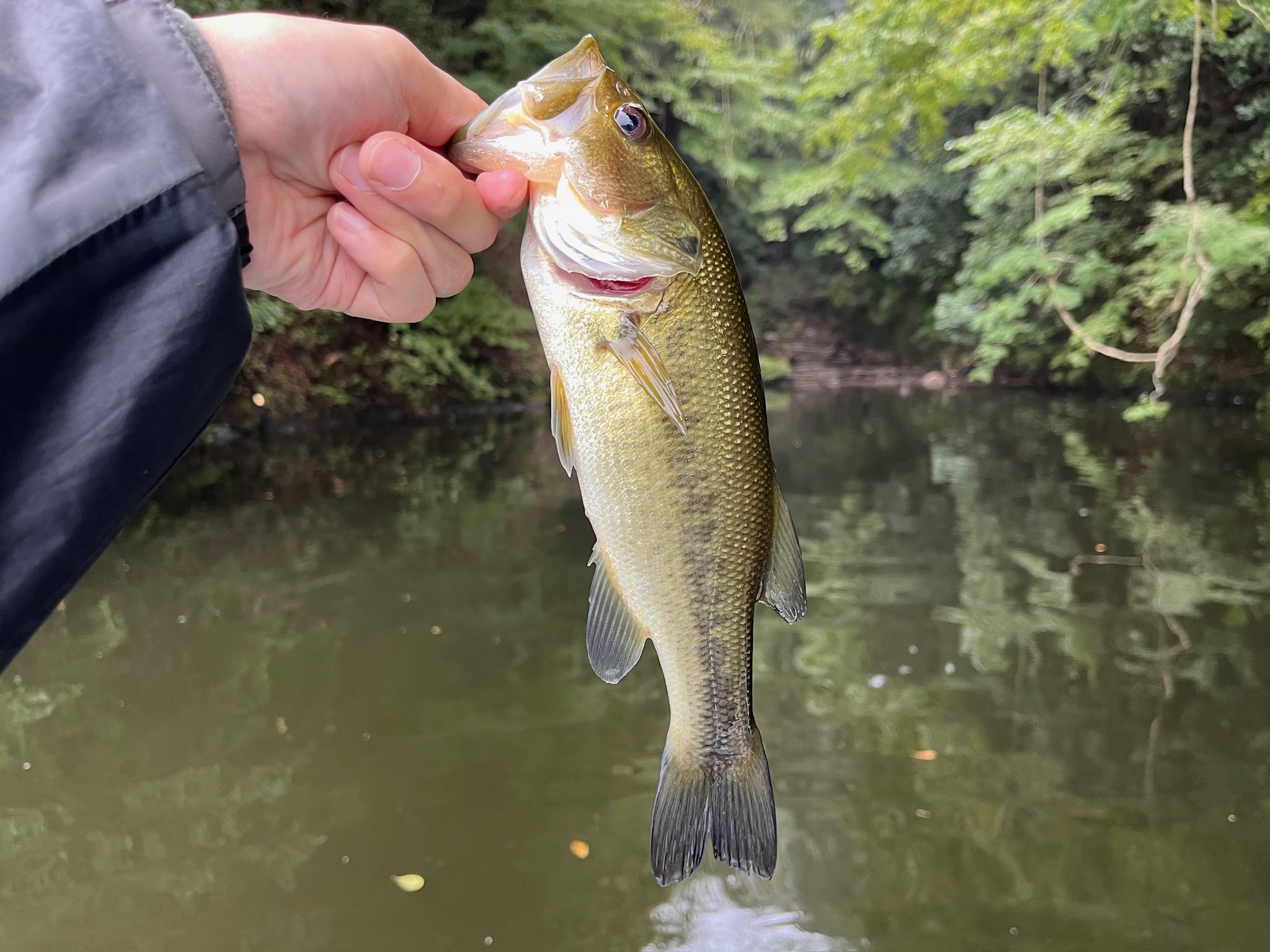 そのまま黒滝エリアまで来ました。ここでは小型を中心としつつも、いつもバスの姿を確認できるエリアです。この日も20センチ前後の小バスが確認できました。天候も急変し、レインウェアが必要なくらい雨も降ってきました。