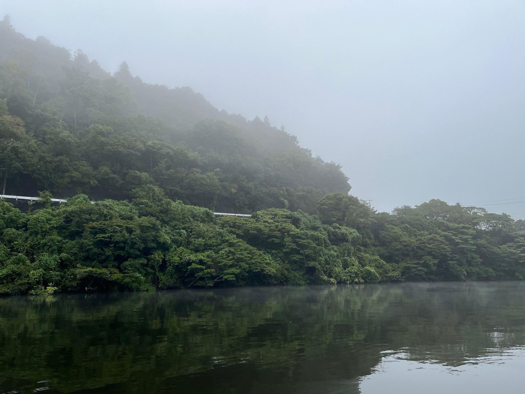 まずはその旧道トンネルまでの岸際をクランクとスピナーベイトで流しながら探ります。湖はモヤに包まれ幻想的な雰囲気がします。湖面に注目するもののボイルなどはなく岸際にも生命感がありません。