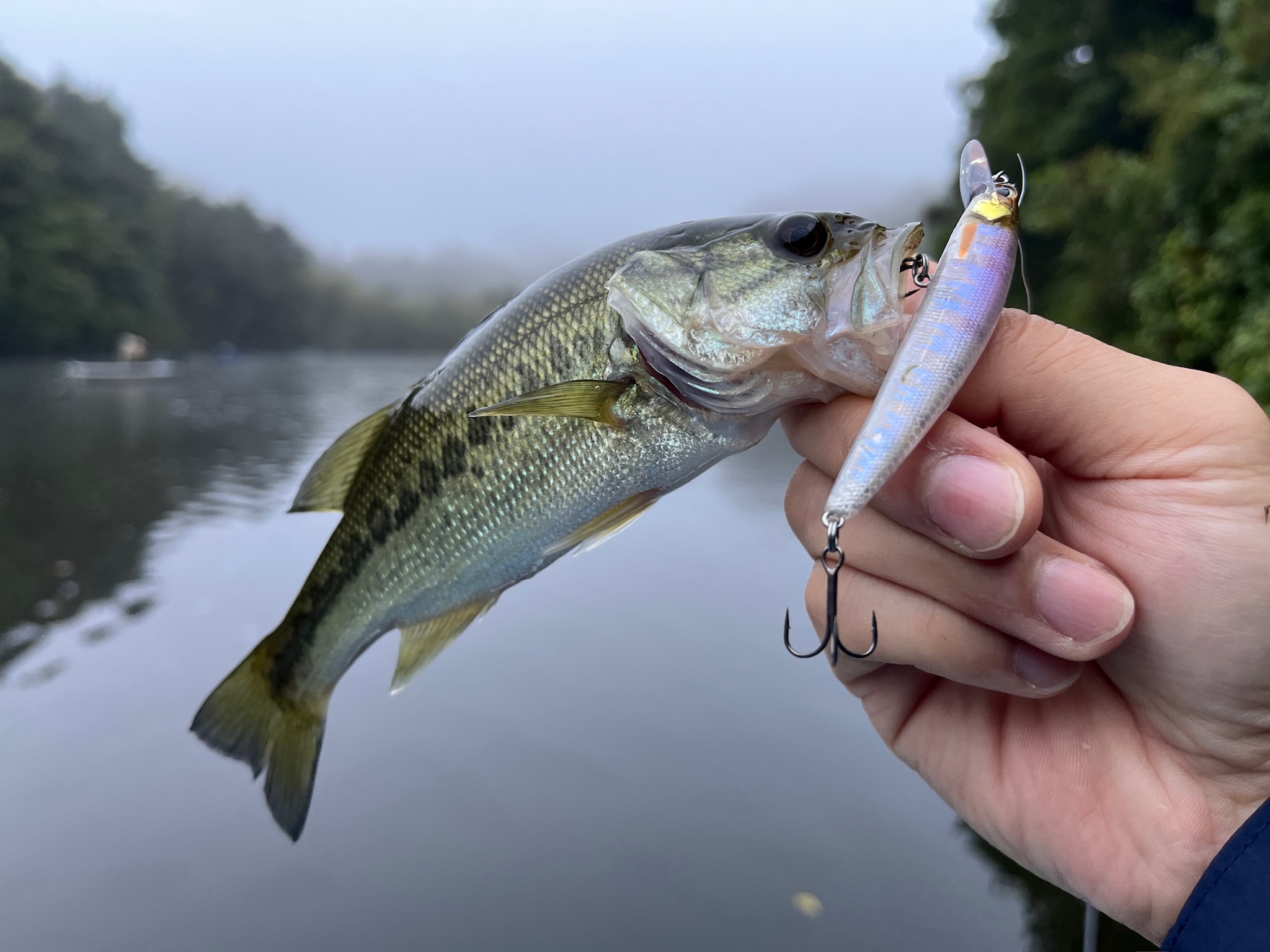 良しっ!これは貴重だ!と思いリールのハンドルを巻き上げます!小型のバスでファイトもすることもなく無事に?抜きあげボートインしました。