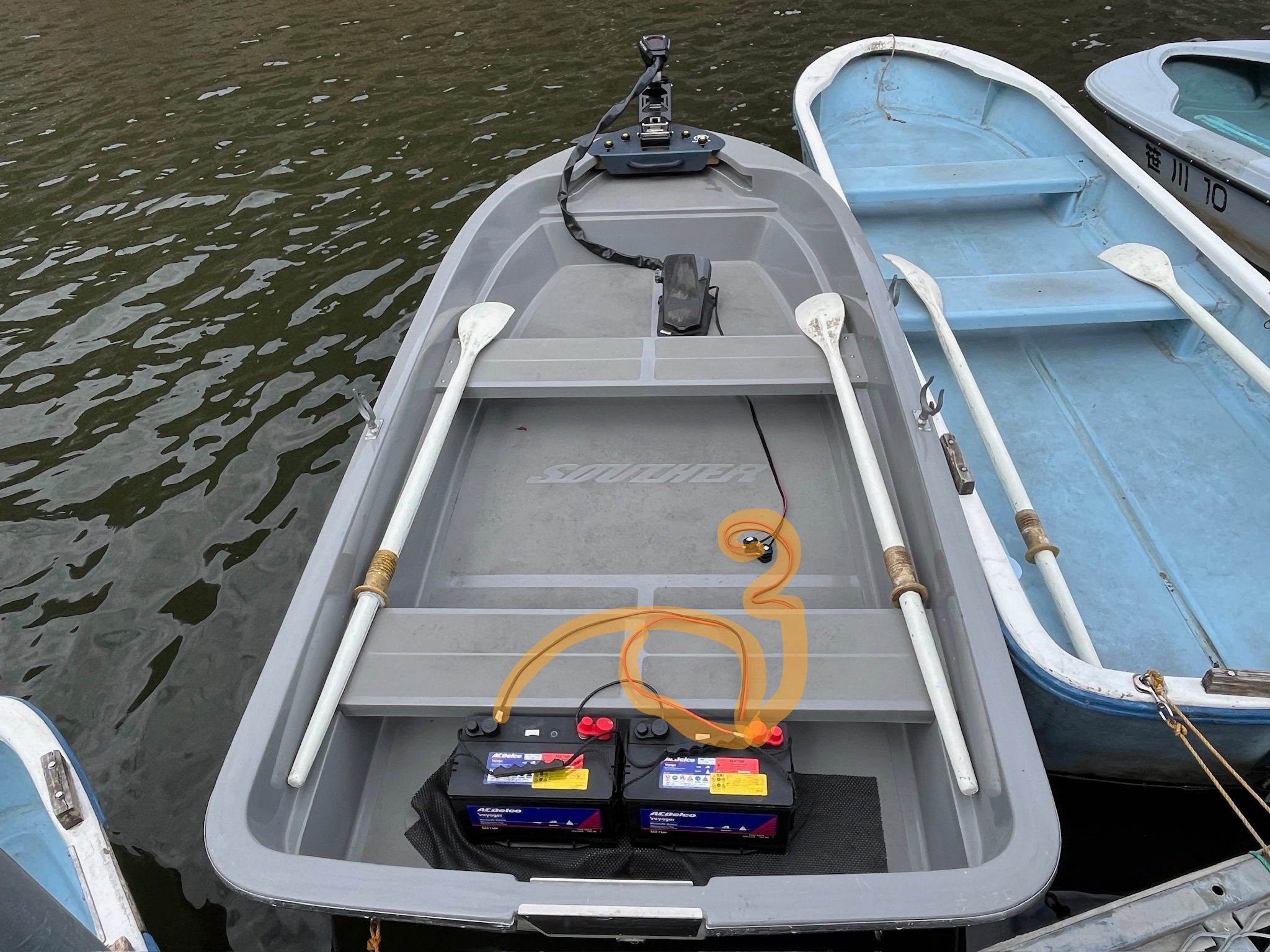船尾に積んだ12Vバッテリーを24Vにするために2つのバッテリーをジャンパーコードで接続しました。おそらくこの後、無意識にボート中央に置いてあったバッカンから、延長ケーブルを取り出し、バッテリーに延長ケーブルを接続したのだと思います。